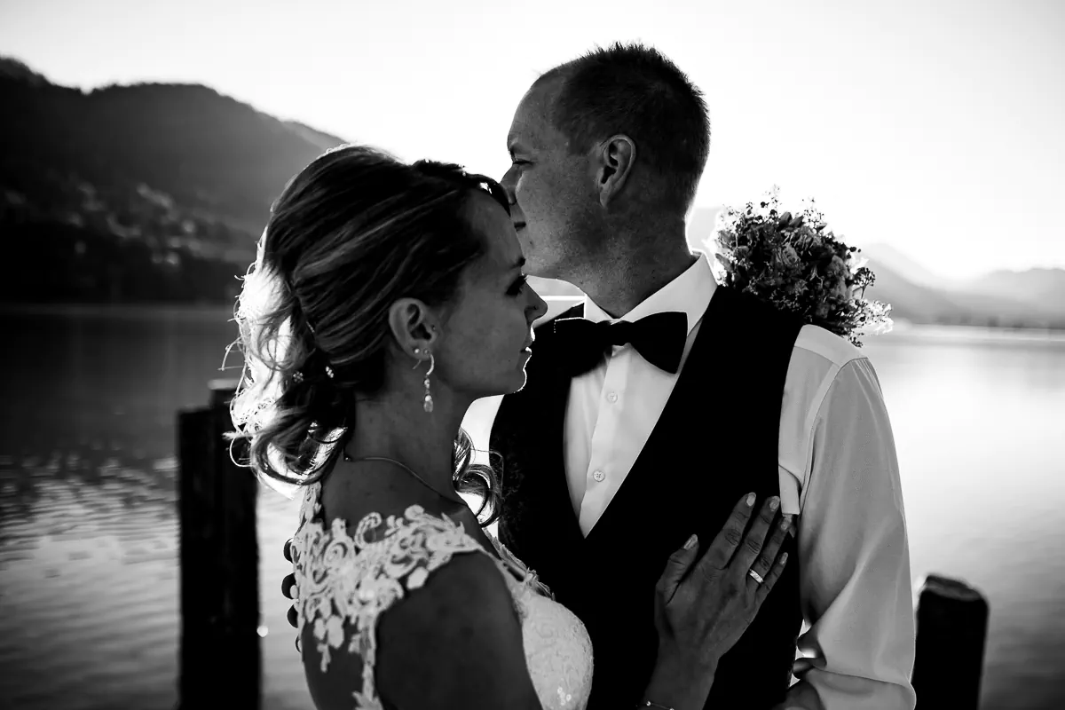 Die Zeremonie selbst fand direkt am Ufer statt, wo das Brautpaar und die Gäste einen ungestörten Blick auf das glitzernde Wasser genießen können. Diese natürliche Schönheit des Sees bietet eine romantische und zugleich feierliche Atmosphäre. Nach dem offiziellen Teil der Feier genossen die beiden eine Bootsfahrt auf dem See. Hier konnten das Brautpaar und die Gäste die malerische Umgebung in vollen Zügen genießen, die frische Bergluft einatmen und auf das gemeinsame Leben anstoßen.